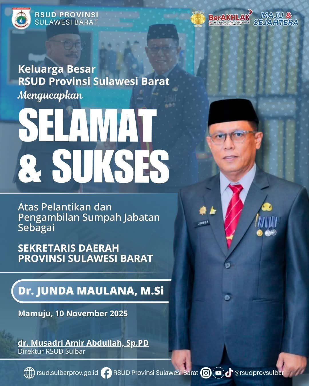 Keluarga Besar RSUD Provinsi Sulawesi Barat Mengucapkan Selamat dan Sukses Atas Pelantikan dan Pengambilan Sumpah Jabatan Sekretaris Daerah Provinsi Sulawesi BaratDr.Juanda Maulana, M.Si Post Views: 8 Categories: Informasi Related 10/11/2025 Selamat Memperingati Hari Pahlawan Nasional 10 November 2025 Dalam rangka memperingati Hari Pahlawan yang jatuh pada tanggal 10 November 2025,… 12/10/2025 Selamat Datang Kepada Direktur Baru RSUD Provinsi Sulawesi Barat Keluarga besar RSUD Provinsi Sulawesi Barat mengucapkan selamat datang dan selamat bertugas… 11/10/2025 Terimah Kasih Atas Pengabdian dan Dedikasi Luar Biasa Sebagai Direktur RSUD Prov Sulbar Periode 2023 – 2025 Atas nama keluarga besar RSUD Provinsi Sulawesi Barat, kami menyampaikan terima kasih… 01/10/2025 SELAMAT MEMPERINGATI HARI KESAKTIAN PANCASILA 05/09/2025 Selamat Merayakan Maulid Nabi Muhammad.S.A.W 12 Rabiul Awal 1447 Hijriah Leave a comment Cancel replyYour email address will not be published. Required fields are marked * Save my name, email, and website in this browser for the next time I comment.