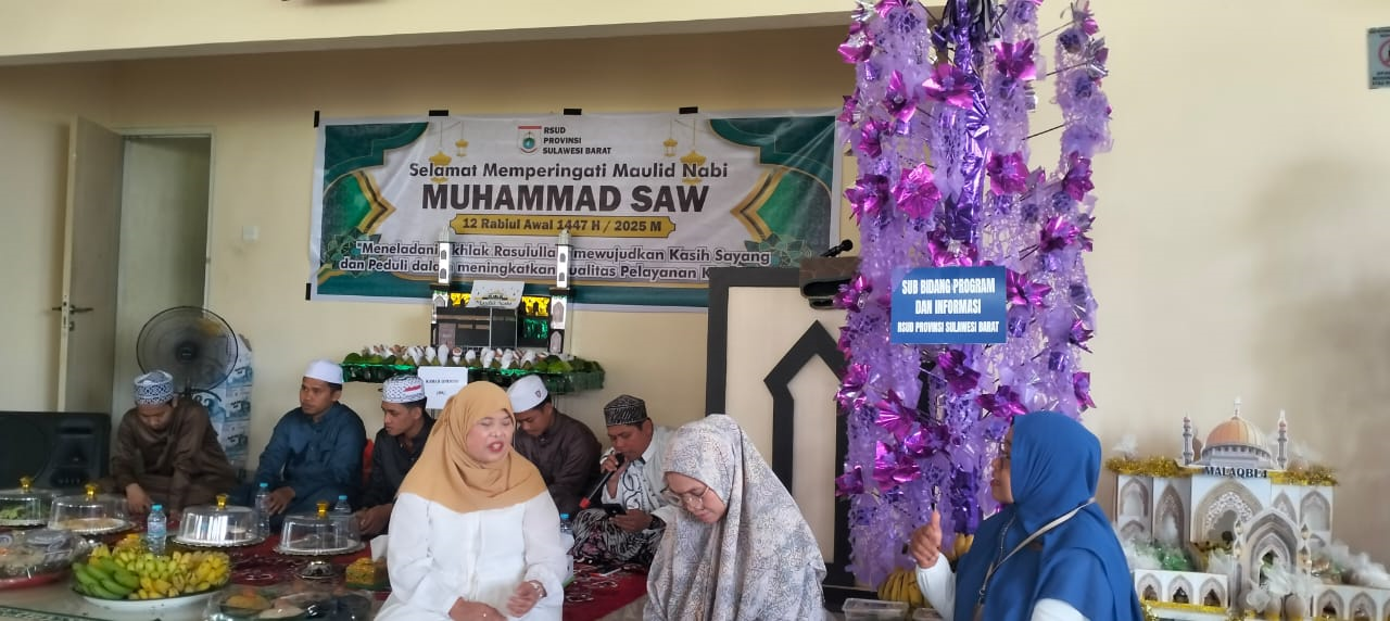 Rumah Sakit Umum Daerah (RSUD) Provinsi Sulawesi Barat menggelar peringatan Maulid Nabi Muhammad S.A.W dengan penuh khidmat dengan tema “ Meneladani Akhlak Rasulullah, Mewujudkan Kasih Sayang dan Peduli dalam Meningkatkan Kualitas Pelayanan Kesehatan. Selasa tanggal 7 Oktober 2025 ,di Mushollah RSUD Provinsi Sulawesi Barat Acara ini dihadiri oleh seluruh staf rumah sakit, mulai dari jajaran Manajemen , tenaga penunjang, hingga tenaga medis dan non-medis.
